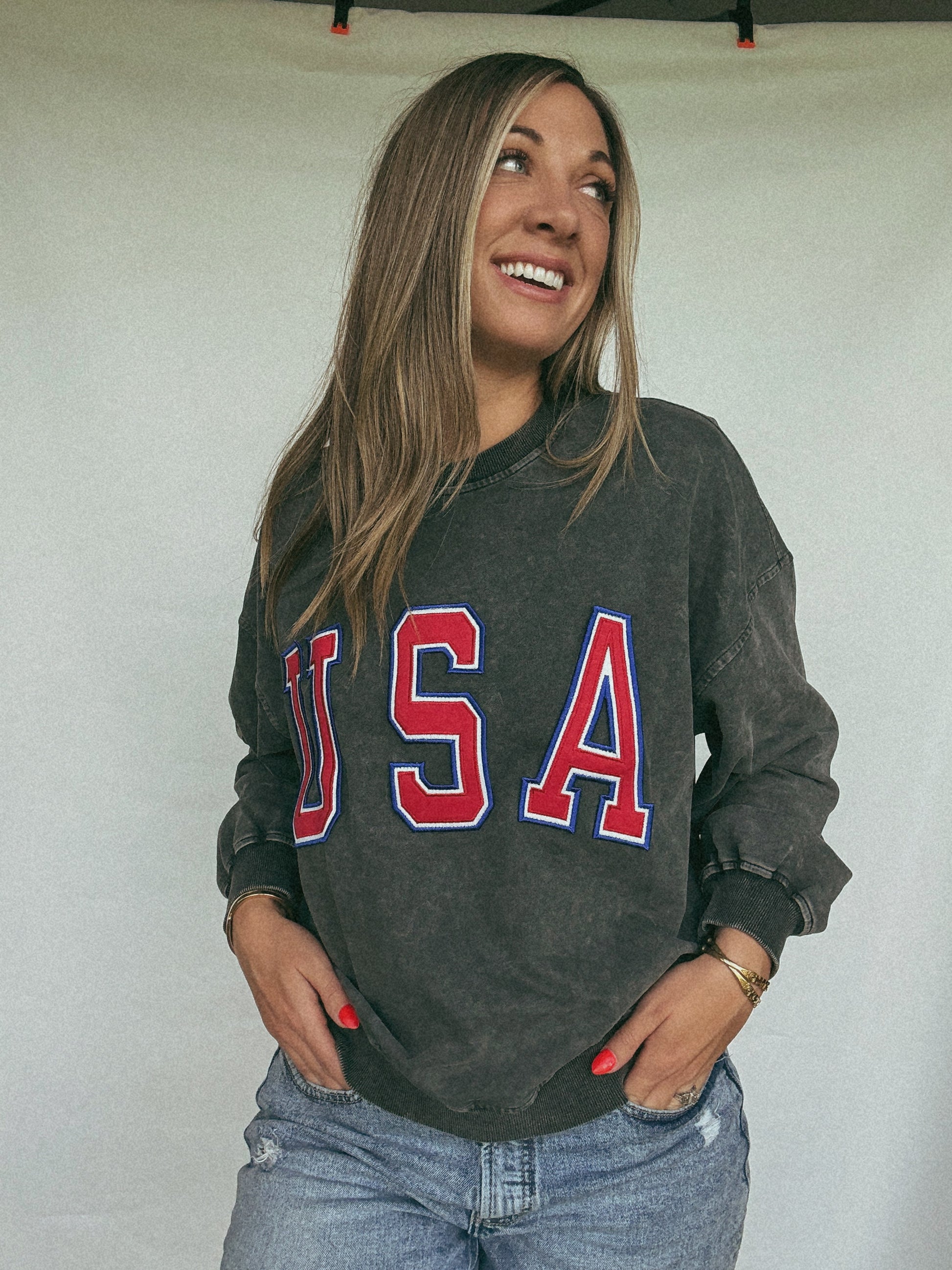 This super soft crew neck is perfect for year round comfort. The USA is bright and bold with the charcoal sweater being perfectly over sized.
